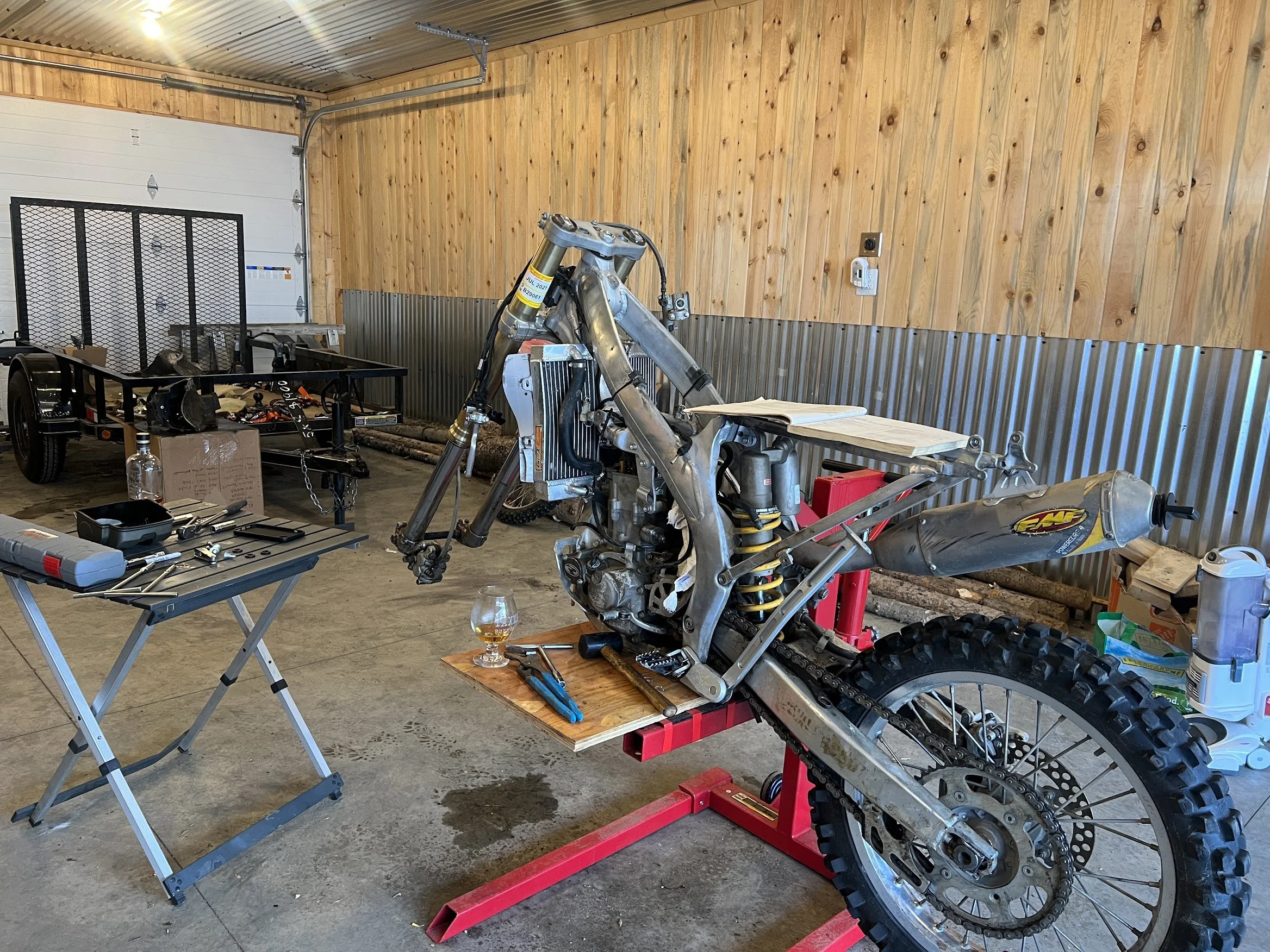This was in the initial list: 1. All headset bearings 2. Rotors needed replaced 3. Drivetrain needed replaced 4. Top end engine work 5. All fluids replaced 6. Front suspension rebuilt 7. All cables replaced 8. Brake calipers rebuilt + new hoses + fluids 9. Carb rebuild (at minimum) 10. Cockpit revamp